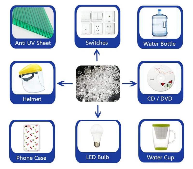 Nhựa PC sử dụng để làm chao đèn, kính bảo vệ,… và cũng có thể sử dụng rộng rãi trong các vật liệu trong suốt trên máy bay.
